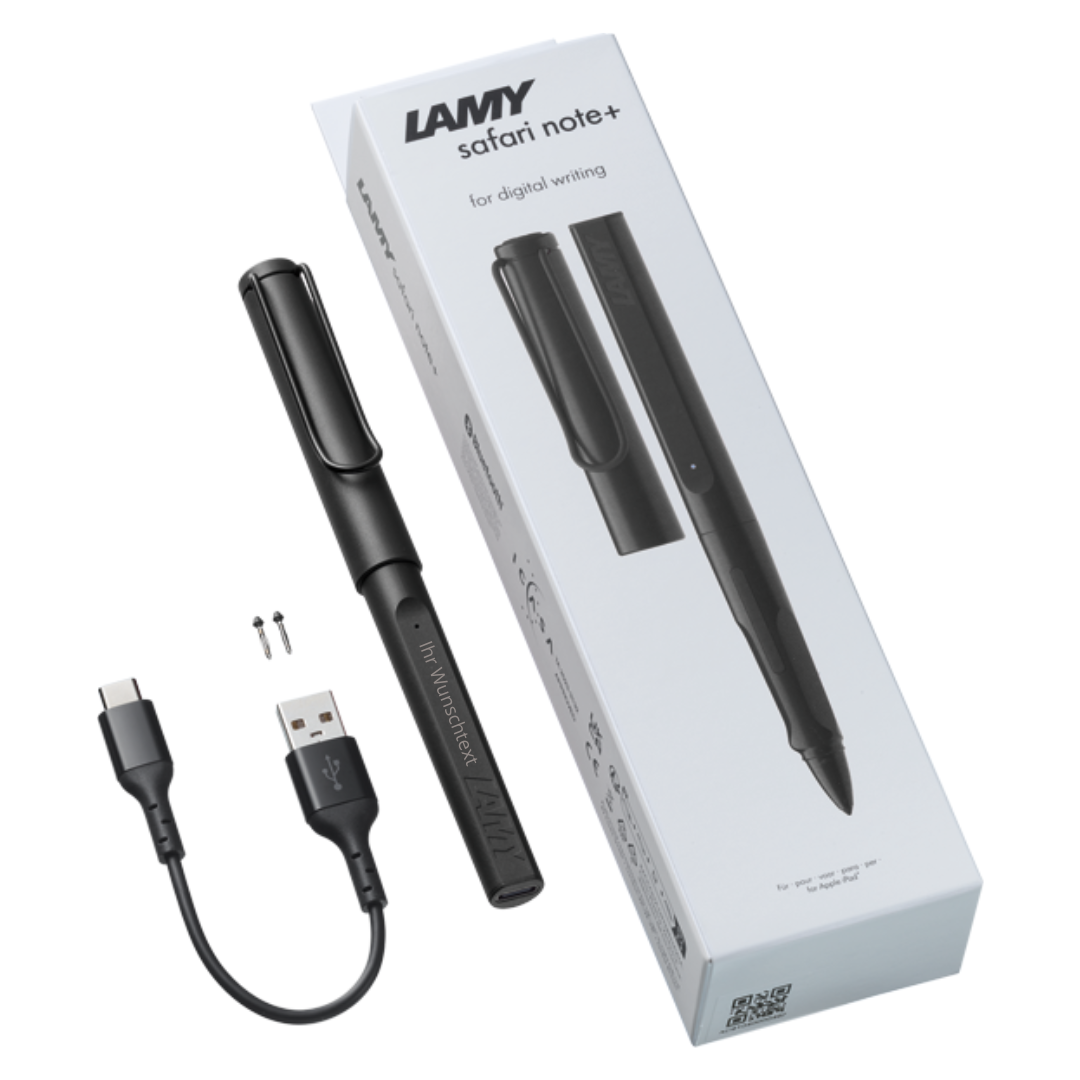 Der LAMY Safari Note+ all-black kombiniert die bewährte Ergonomie des klassischen LAMY Safari mit moderner Digitaltechnologie. Perfekt für Notizen, Skizzen und kreatives Arbeiten auf deinem iPad – ganz ohne Einrichtung!