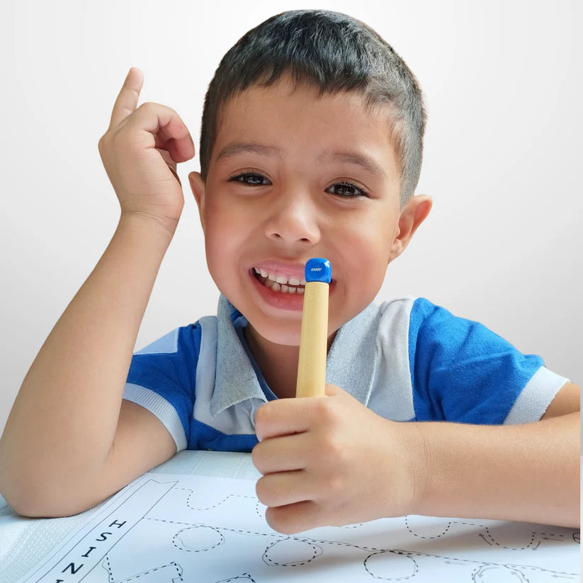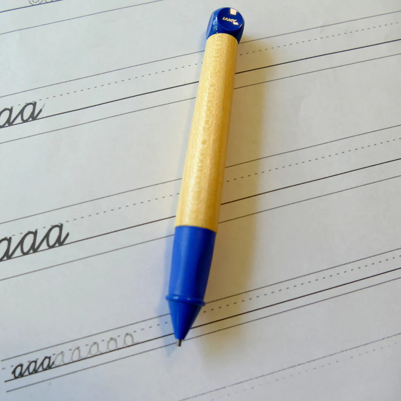 Der Lamy abc Schreiblernstift aus Ahornholz, Kappe und Würfel aus rotem bzw. blauem Kunststoff. Mit rutschfestem, gummiertem Kunststoff-Griffstück. Bleistift mit Drehmechanik für Feinstrichmine LAMY M 44 (1,4).